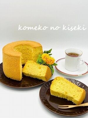 お米の素朴な甘さを引き出すため、きび砂糖は控えめにしあっさりとしたお味に仕上げました。米粉で作っているとは思えないほど、小麦のシフォンケーキと変わらない食感と美味しさです。米粉の「もっちり」とした食感がちょっと苦手な方にも好評!